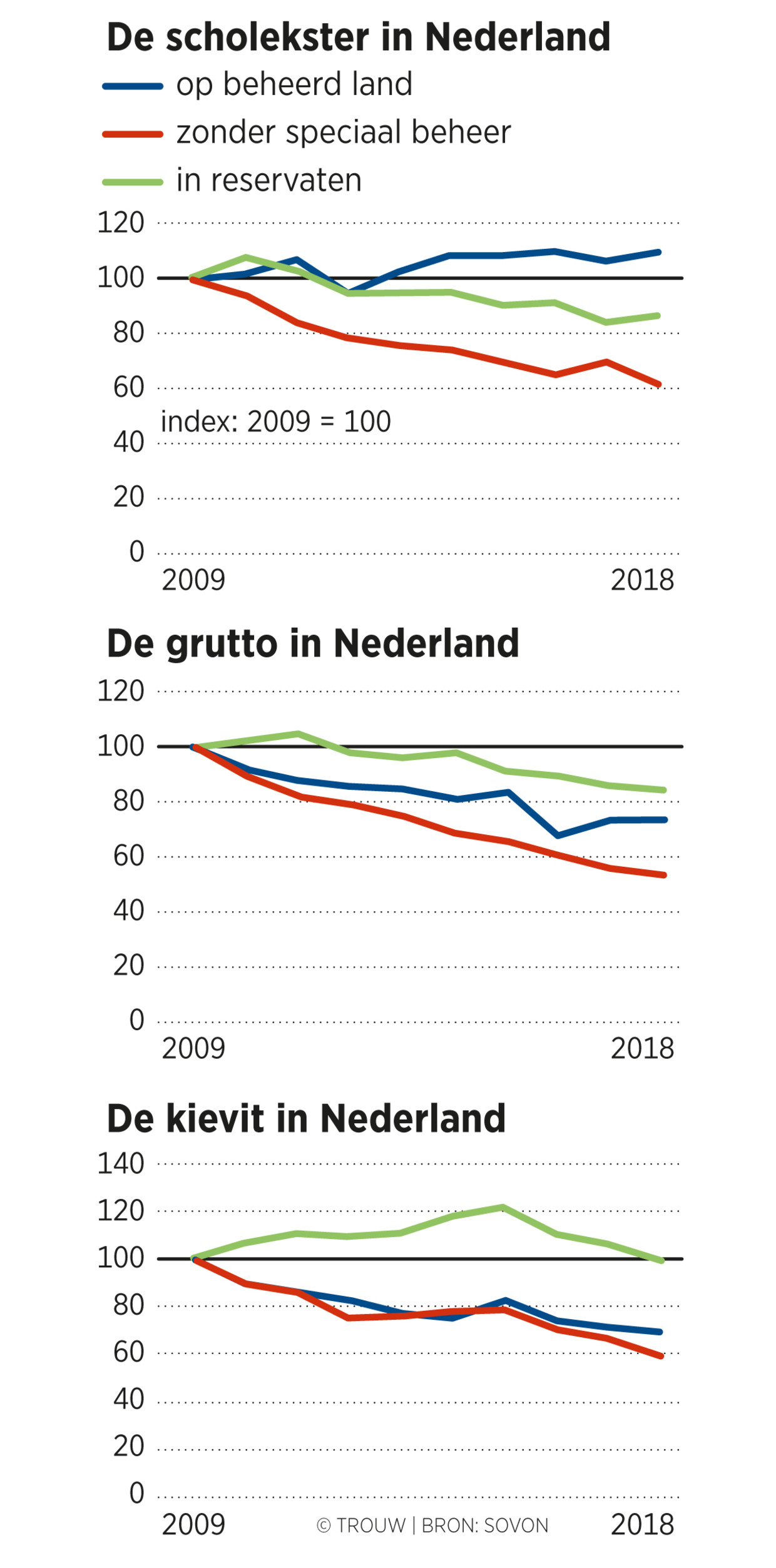 Ook Teunissen blikt niet met optimisme terug. “Eind vorig jaar hebben we gekeken naar de effecten van weidevogelbeheer. Dan hebben we het over zwaar beheer, plas-dras, maaien na 15 juni. Slechts ongeveer drie procent van het weidegebied valt onder dat type beheer. Ik ben er zelf van geschrokken, zo weinig. Op die drie procent weiland worden dus maatregelen getroffen die de weidevogels zouden moeten helpen. En die maatregelen zouden de situatie moeten compenseren voor de overige 97 procent waarop het niet goed gaat? Nou, je voelt met je boerenverstand dat dat nooit gaat lukken natuurlijk.